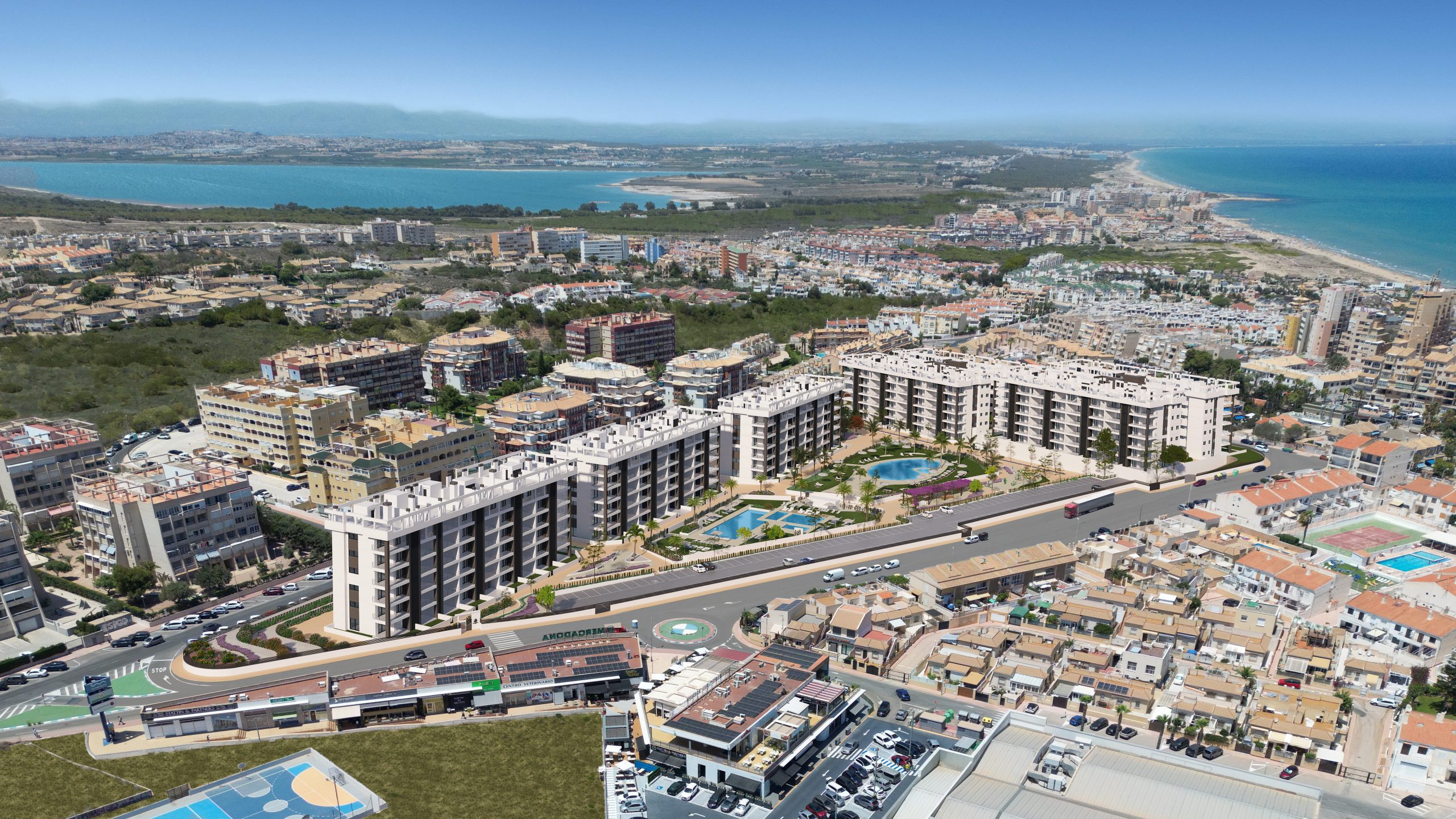 Torrevieja is the nerve center of the province of Alicante. Within a 20 km radius, you’ll find top-class golf courses such as Villamartín, Campoamor and las Ramblas, as well as shopping centers with top names, bars, restaurants, medical services and all the amenities of a city center. All just 700 metres from the beach.