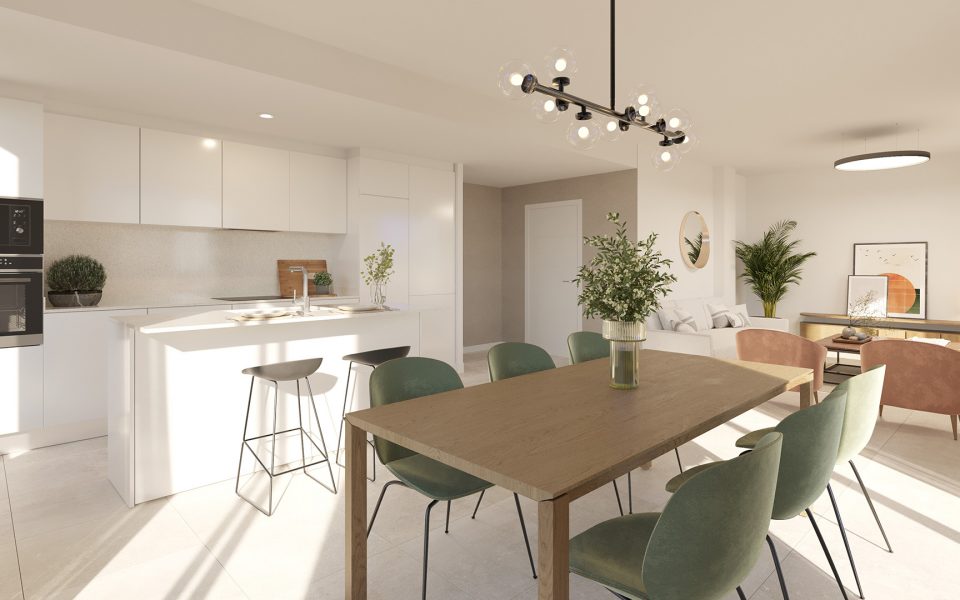 Spacious rooms, large-format porcelain floors and extra-large windows extended by expansive terraces support the sense of space and freedom. The kitchens, key elements of a warm and welcoming home, have been designed as an indivisible unit from the living room, reinforcing the feeling of space and functionality.