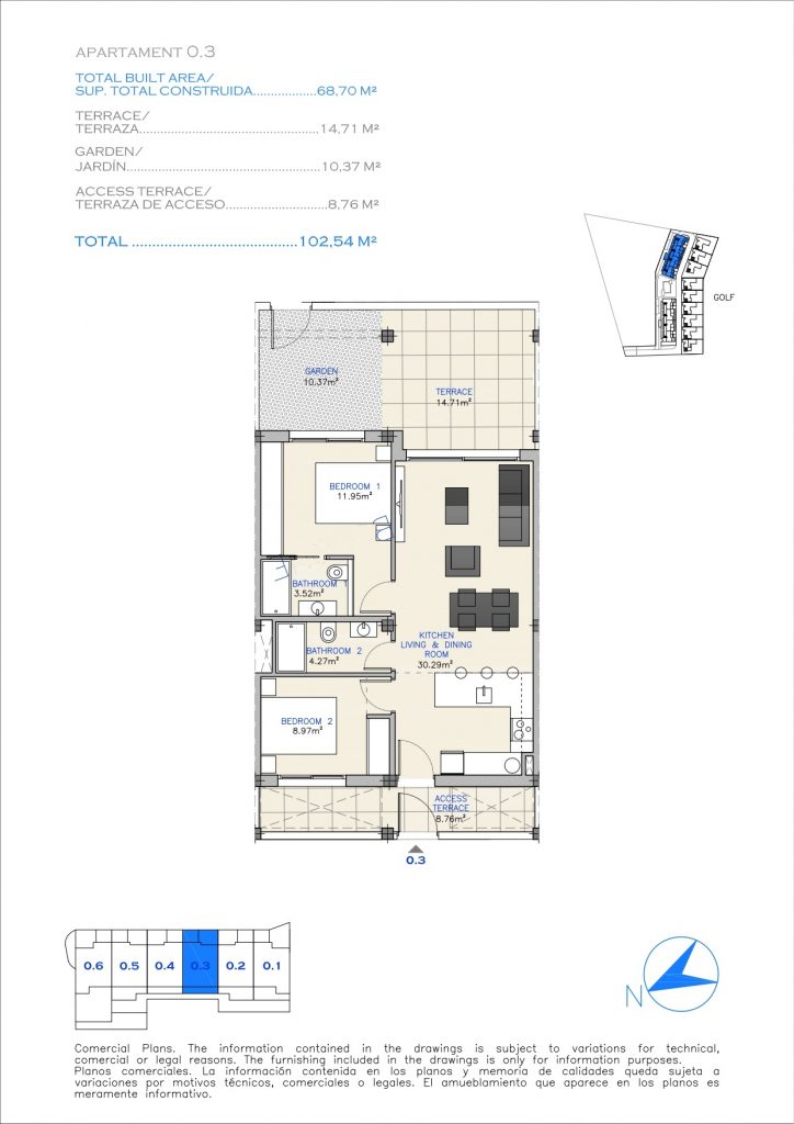 Le complexe est composé de 32 appartements de 2 et 3 chambres et 9 villas de luxe combinant modernité, qualité et fonctionnalité, au coeur d’un parcours de golf et à seulement 25 minutes de l’aéroport de Murcie et 55 minutes de l’aéroport d’Alicante.