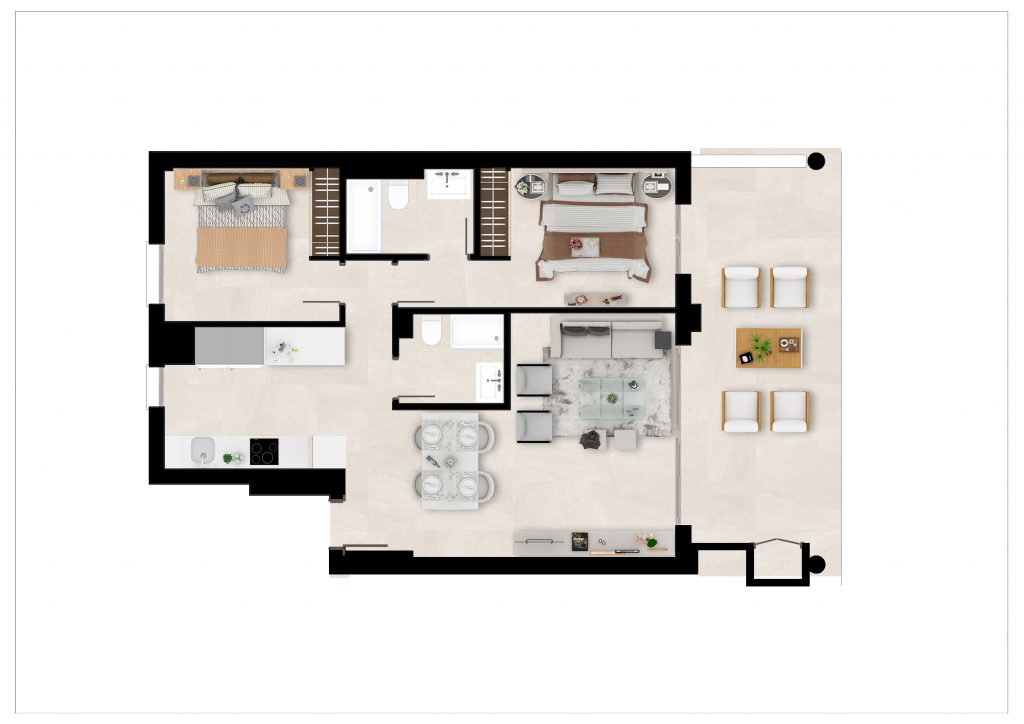 Ce complexe résidentiel face au golf de Mijas se distingue par la lumière naturelle que reçoivent les appartements et les spacieuses terrasses. Les logements sont distribués de façon moderne selon le concept de « total living », où l’espace est utilisé au maximum avec un grand salon intégré à la terrasse par de grandes baies vitrées.