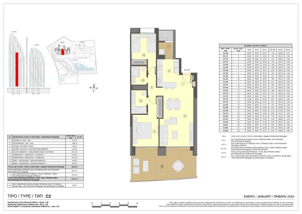 Au total, 286 appartements composent ces 2 tours sur 31 étages pour l’une et 41 pour l’autre, avec une large diversité de typologies pour que chacun trouve celle qui lui correspond. Laissez-vous surprendre par un agencement conçu pour vous faire vivre à 100% votre nouvelle vie en bord de mer. Tous les logements de cette exceptionnelle résidence face à la mer à Benidorm comprennent une grande fenêtre dans la salle de bains avec vue sur la mer, des stores motorisés et un chauffage au sol dans les salles de bains. En outre, le constructeur vous offre de nombreuses options de personnalisation et d’ameublement pour faire de votre nouveau logement un espace unique qui ne ressemble qu’à vous.