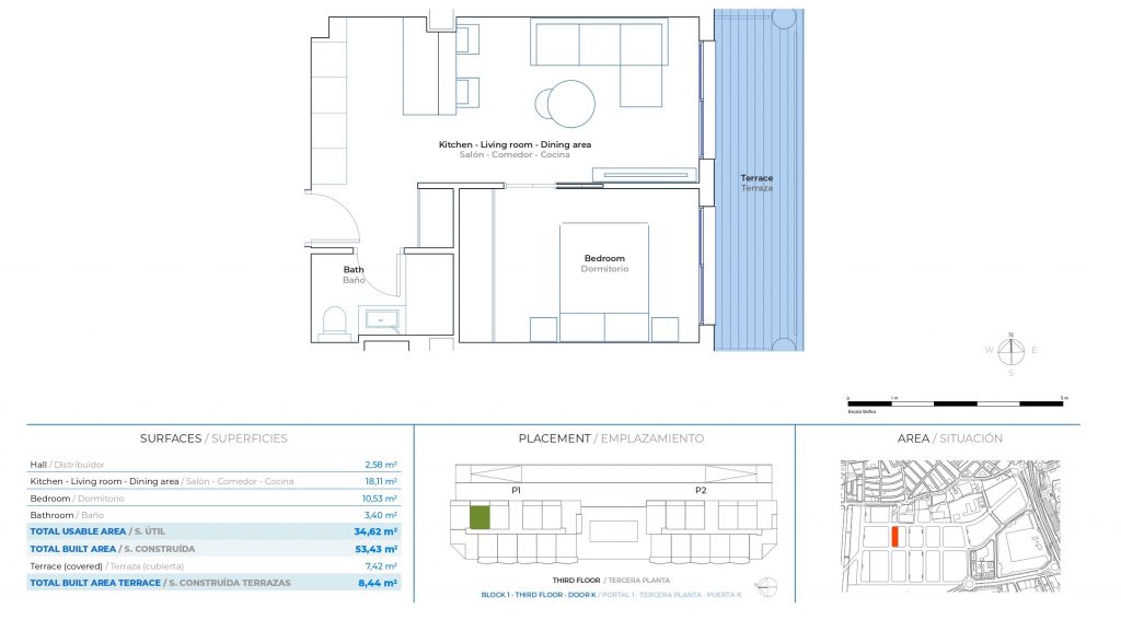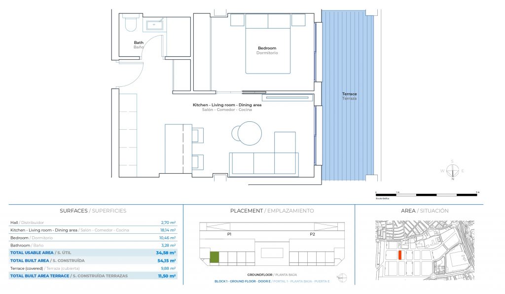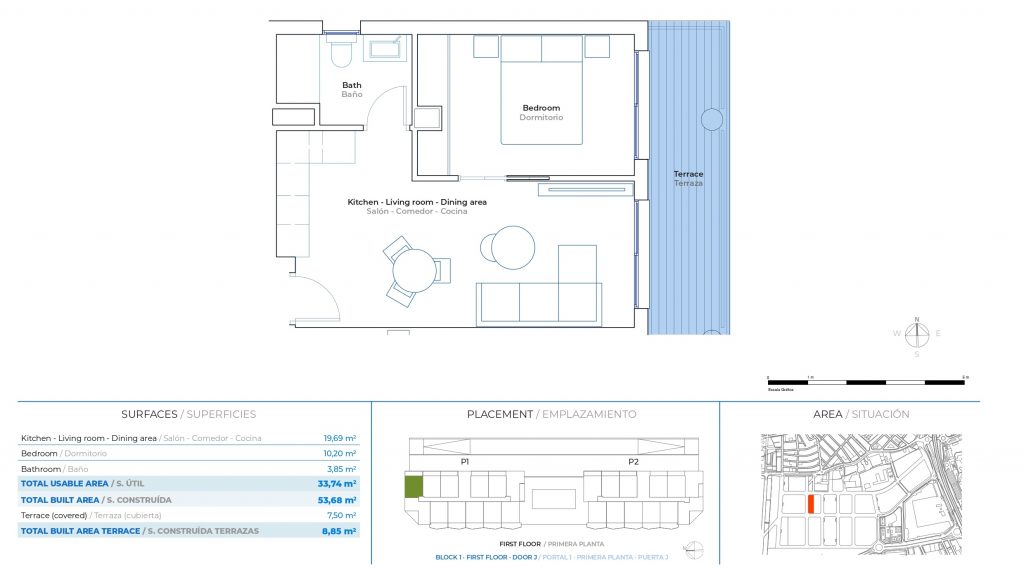 Les intérieurs ont été conçus pour offrir une expérience de vie moderne et accueillante. Les espaces ouverts qui relient le salon, la cuisine et la chambre, finis dans des tons chauds, et une sélection minutieuse de matériaux naturels créent une atmosphère équilibrée et lumineuse. La terrasse, intégrée comme une extension de la maison, vous invite à profiter de la lumière et de l’environnement tous les jours.