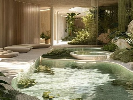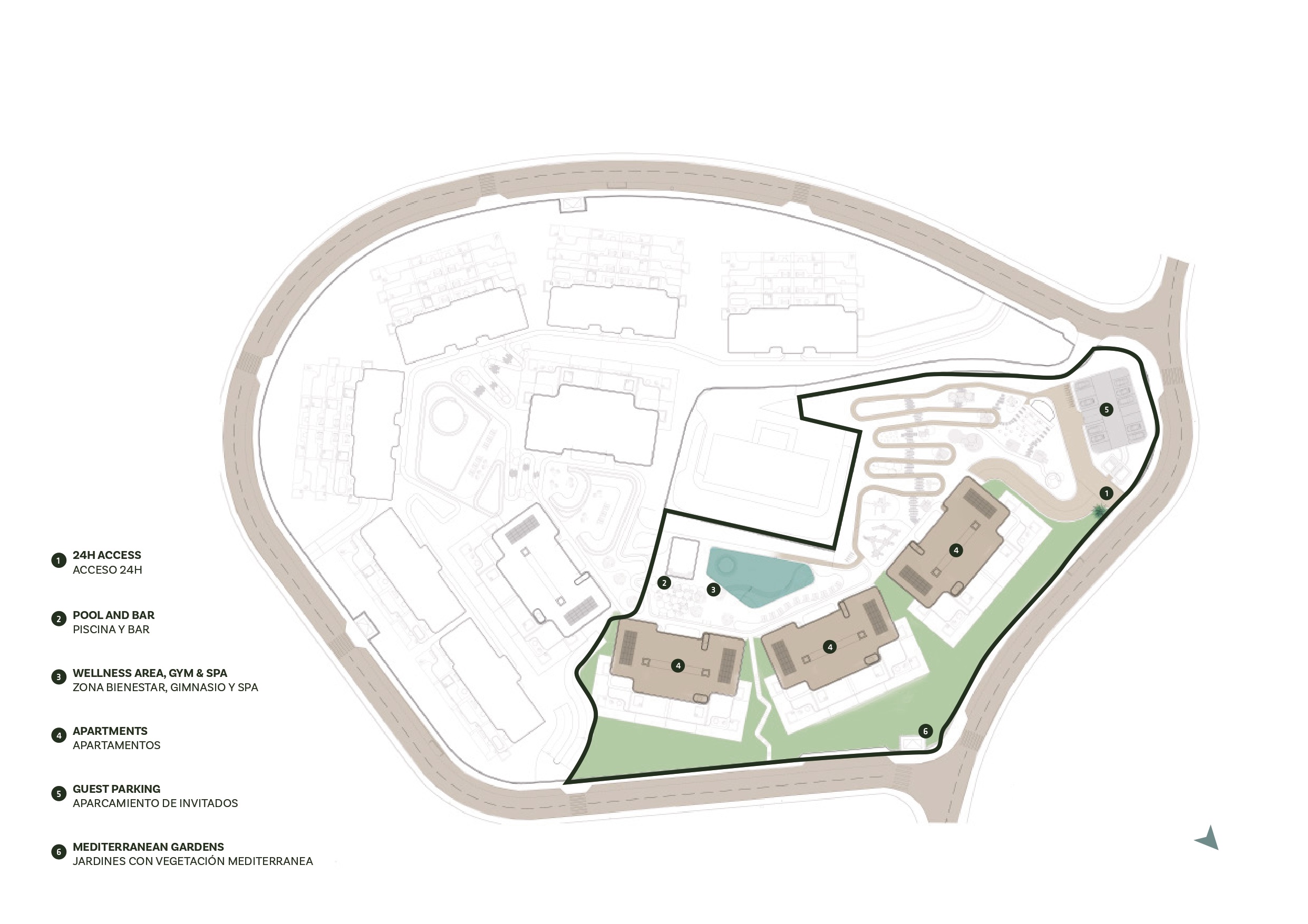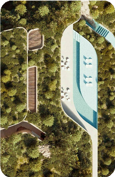 L’intégration de la végétation méditerranéenne et tropicale y est constante. Composée de plantations d’arbustes créant un environnement enveloppant dans les zones clés : piscines, zones d’exercice et zones de loisirs en plein air.