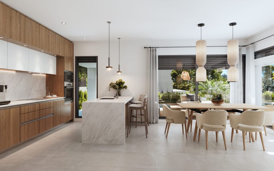 La cuisine, équipée d’un élégant îlot central, est le cœur de la maison, parfaite pour cuisiner et partager des moments privilégiés avec la famille et les amis. Le grand porche couvert devient une extension naturelle du salon, idéal pour se détendre et profiter du climat méditerranéen tout au long de l’année.