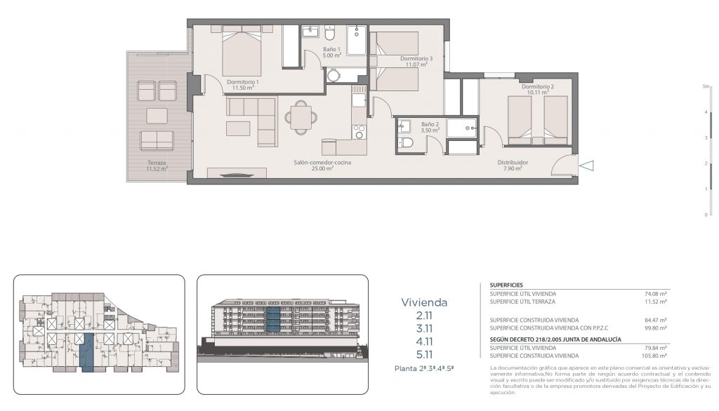 L’ensemble offre 99 propriétés avec 1, 2 et 3 chambres avec des dimensions variant entre 60 m² et 120 m². Le bâtiment se distingue par son design moderne d’architecture contemporaine, avec des matériaux et des finitions de qualité supérieure. De plus, les espaces communs sont soigneusement pensés pour créer une atmosphère accueillante pour les résidents.